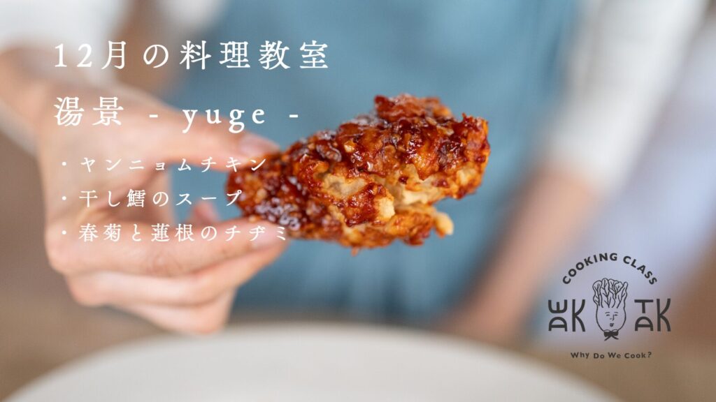 12月のメイン料理は、ヤンニョムチキン・干し鱈のスープ・春菊と蓮根のチヂミ