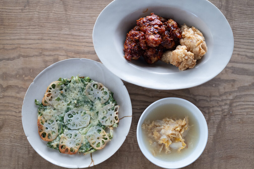そこには、旬の香りが広がる春菊と蓮根のチヂミと、クリスマスやお正月に備えてヤンニョムチキンをお届けします。